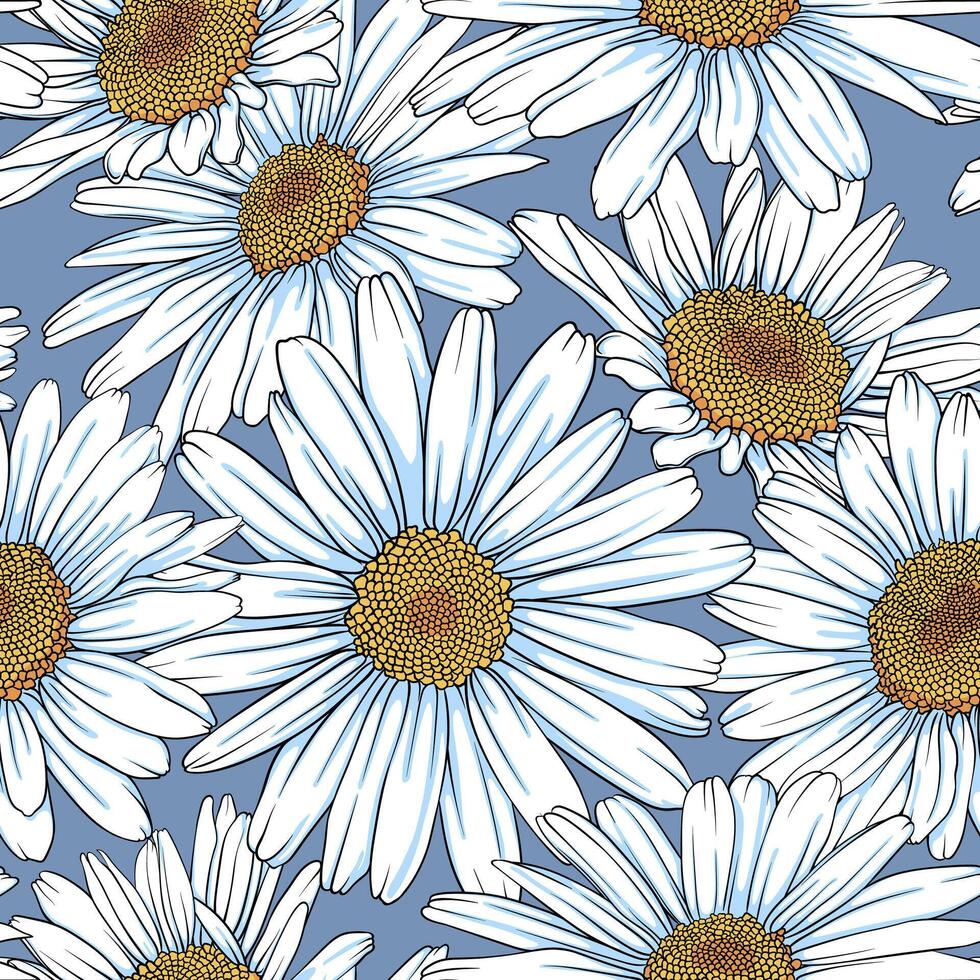 Seamless pattern with white chamomile on a blue background. vector background for wrapping paper, wallpaper or cover of notebook, notepad Pro Vector