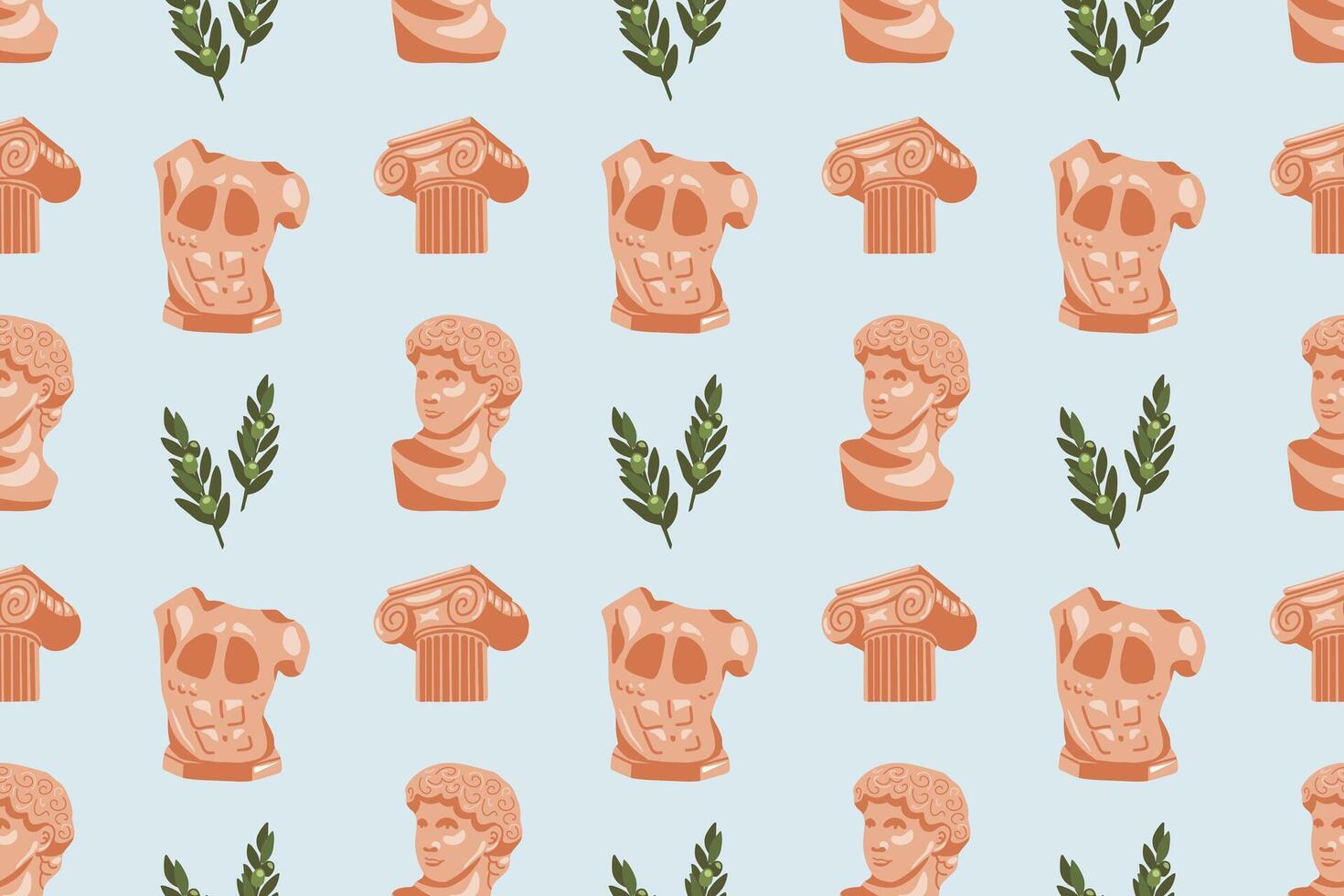 Ancient Greek seamless pattern on blue background with bust of Apollo, statue, column and olive branches on blue sky background. Historical pattern for unique designs and wrapping paper Pro Vector
