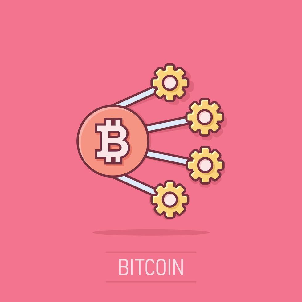 Bitcoin icon in comic style. Blockchain cartoon vector illustration on isolated background. Cryptocurrency splash effect business concept. Pro Vector