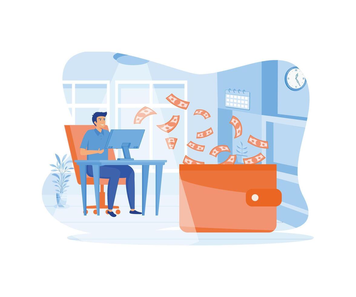 Making money online. Bearded man working at desk with computer and money flowing from screen to wallet. flat vector modern illustration Pro Vector