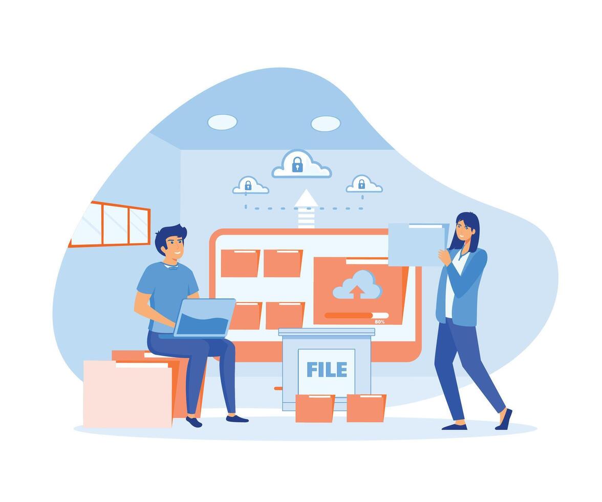 Team administrator and developer working with computer monitor. flat vector modern illustration Pro Vector