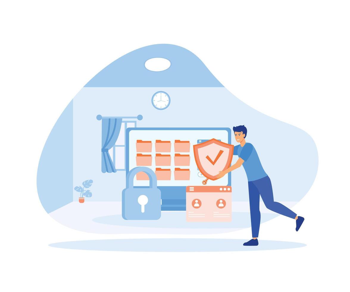 Flat personal cyberspace data security man user with shield log in protection web access control concept. flat vector modern illustration Pro Vector