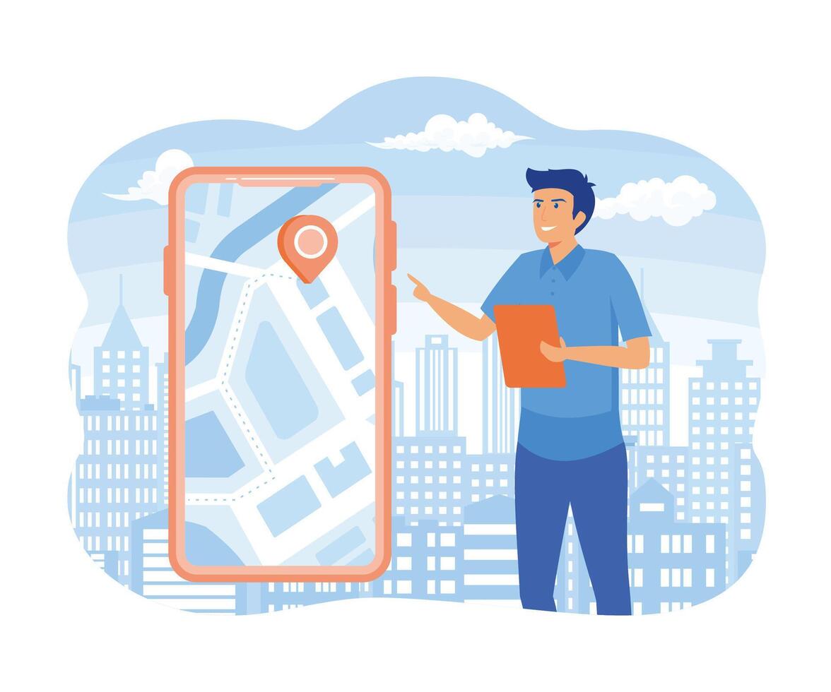 Man using maps app on cell phone. Male trying to navigate terrain, building route. Search by geolocation GPS navigator Tracking location of person Maps navigation with point marker. Pro Vector