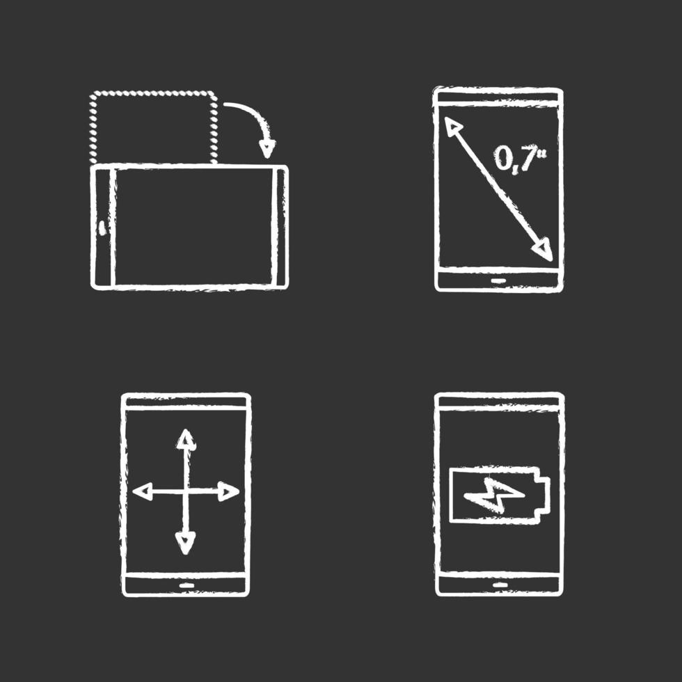 Smartphone chalk icons set. Display inch size, screen rotation and resize, battery charging. Isolated vector chalkboard illustrations Pro Vector