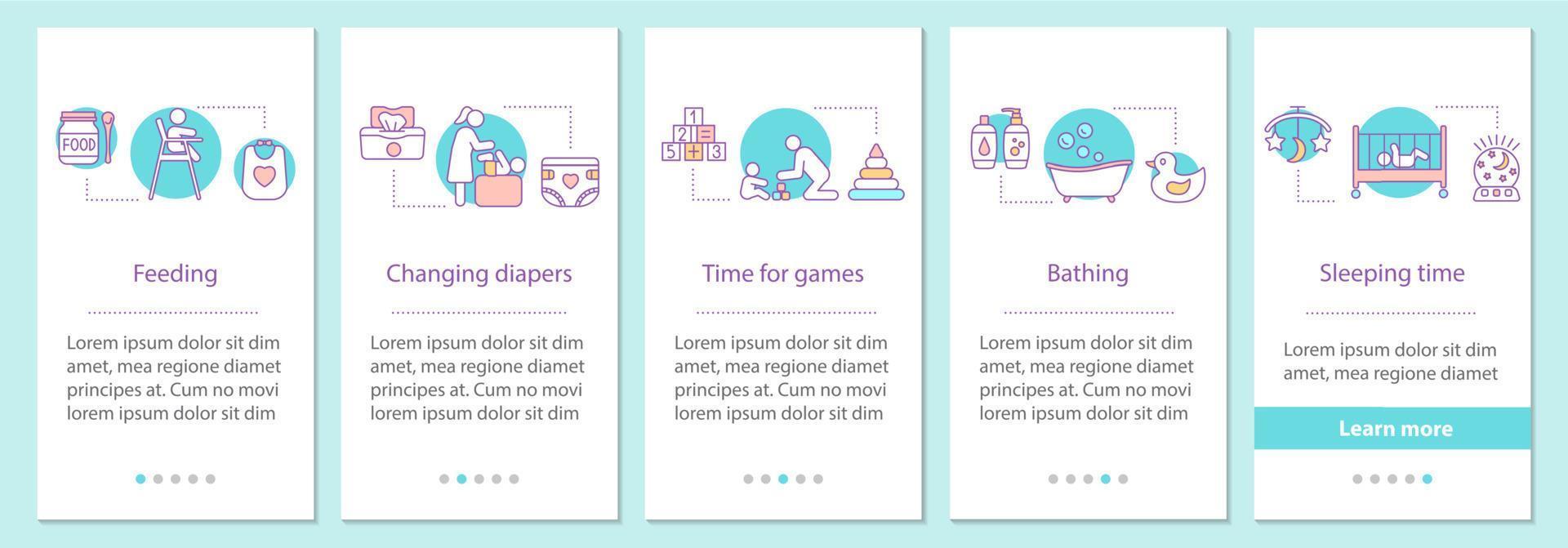 Childcare onboarding mobile app page screen with concepts. Feeding, changing diapers, playing games, bathing, sleeping time steps graphic instructions. UX, UI, GUI vector template with illustrations Pro Vector