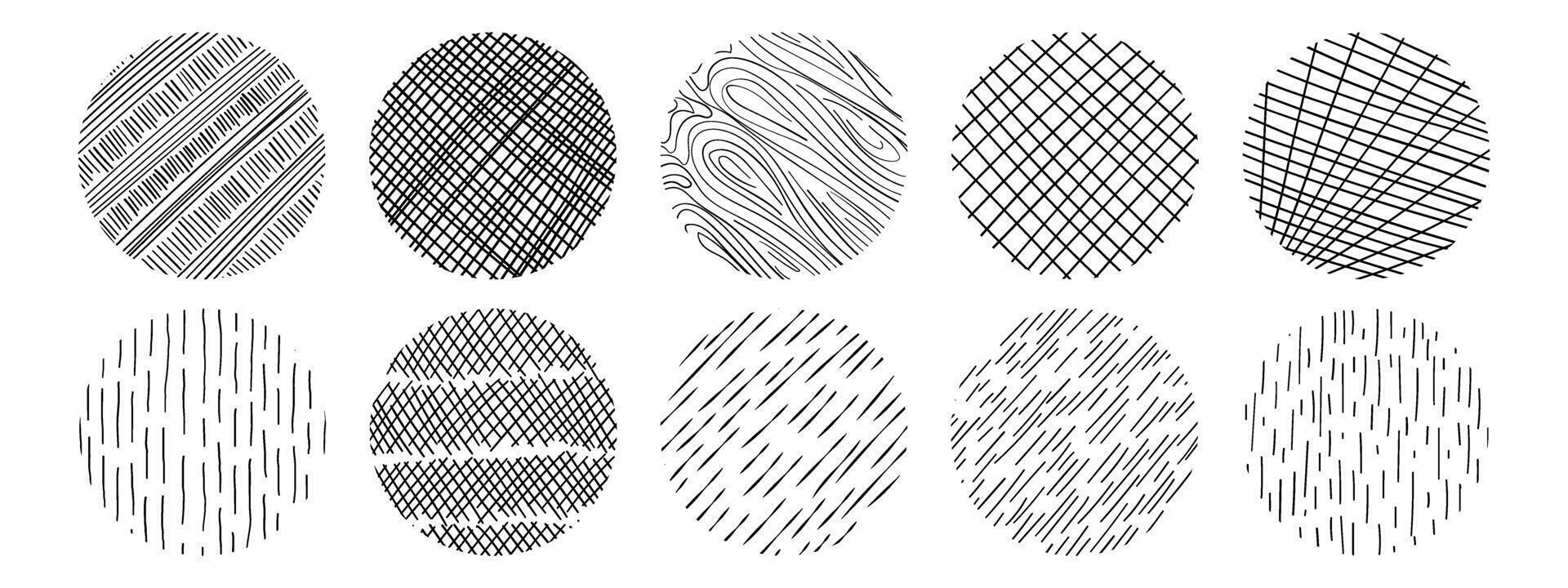 Set of textures with different hand drawn circle patterns. Vector scribble, horizontal and wave strokes collection. Pro Vector