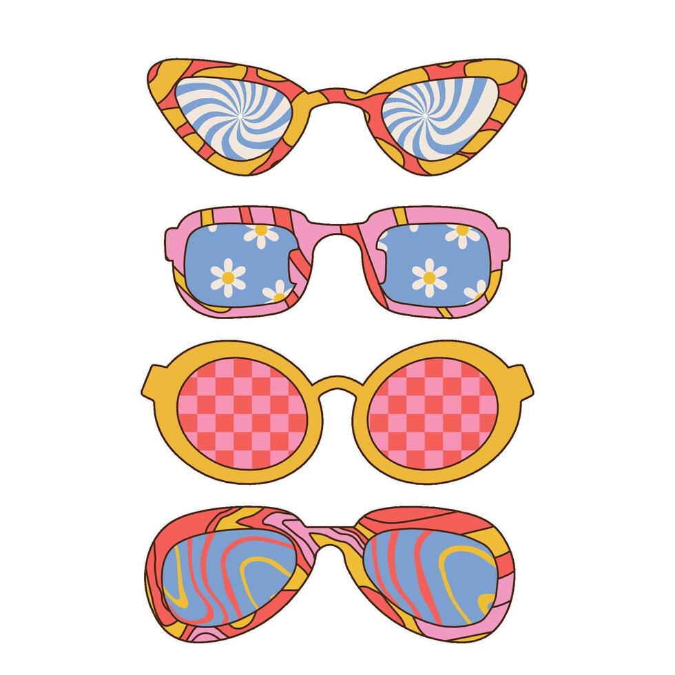 Set of Groovy Sunglasses in 70s Retro Hippie Style. Geometric Abstract Eyewear in Different Forms with groovy patterns inside for Print on T-Shirts, Cards. Linear hand drawn vector illustration. Pro Vector