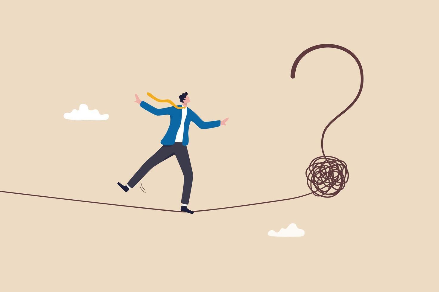 Uncertainty, unknown problem, challenge to overcome or investment risk, find out solution for business difficulty, adversity or determination, businessman acrobat rope walking to find question mark. Pro Vector