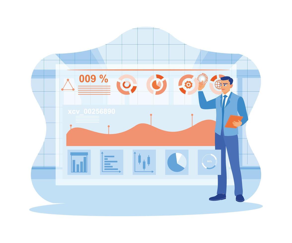 Businessman standing in front of the virtual screen. The graphical interface shows sales reports, profit graphs, and stock market analysis, business intelligence technology and big data concept. Pro Vector
