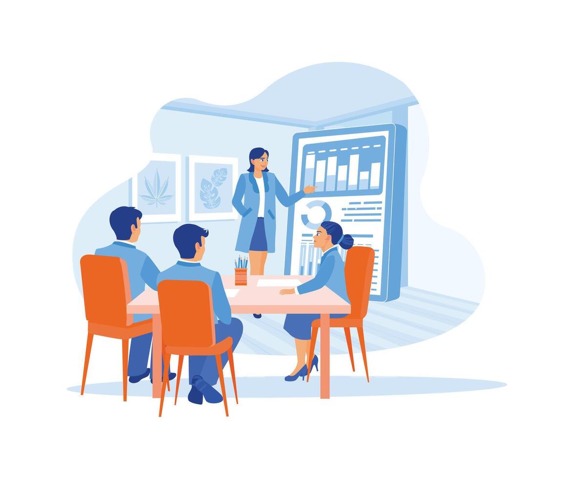 The female manager is holding a presentation with the marketing team. The manager uses a digital whiteboard to analyze growth graphs, statistics and data. Growth Analysis concept. Pro Vector