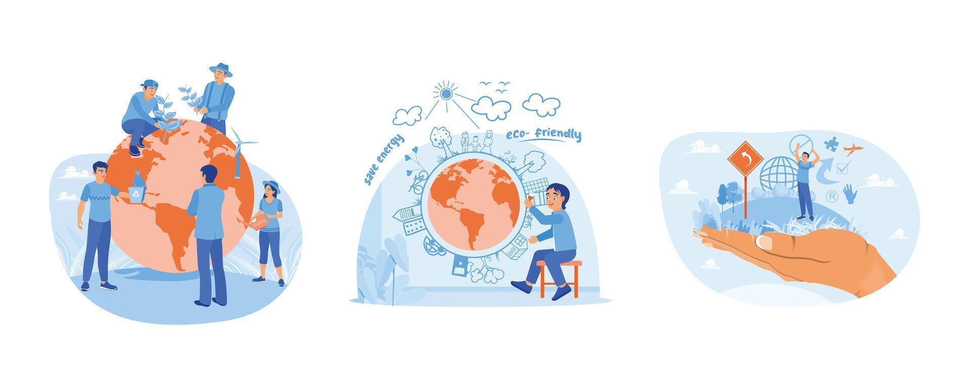 Saving the planet concept. Protect and care for the environment. Create creative, environmentally friendly images. Eco is a familiar concept with the globe. set flat vector modern illustration Pro Vector
