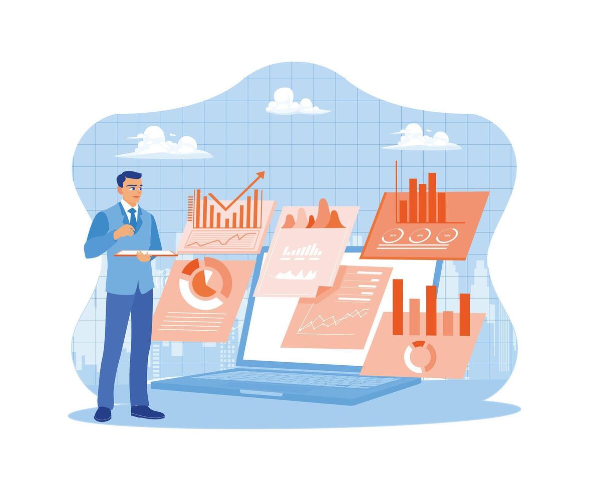 Businessman uses a laptop and digital tablet with financial reports, big data technology, analysis dashboards, finance, and data science. Business intelligence technology and big data concept. Pro Vector