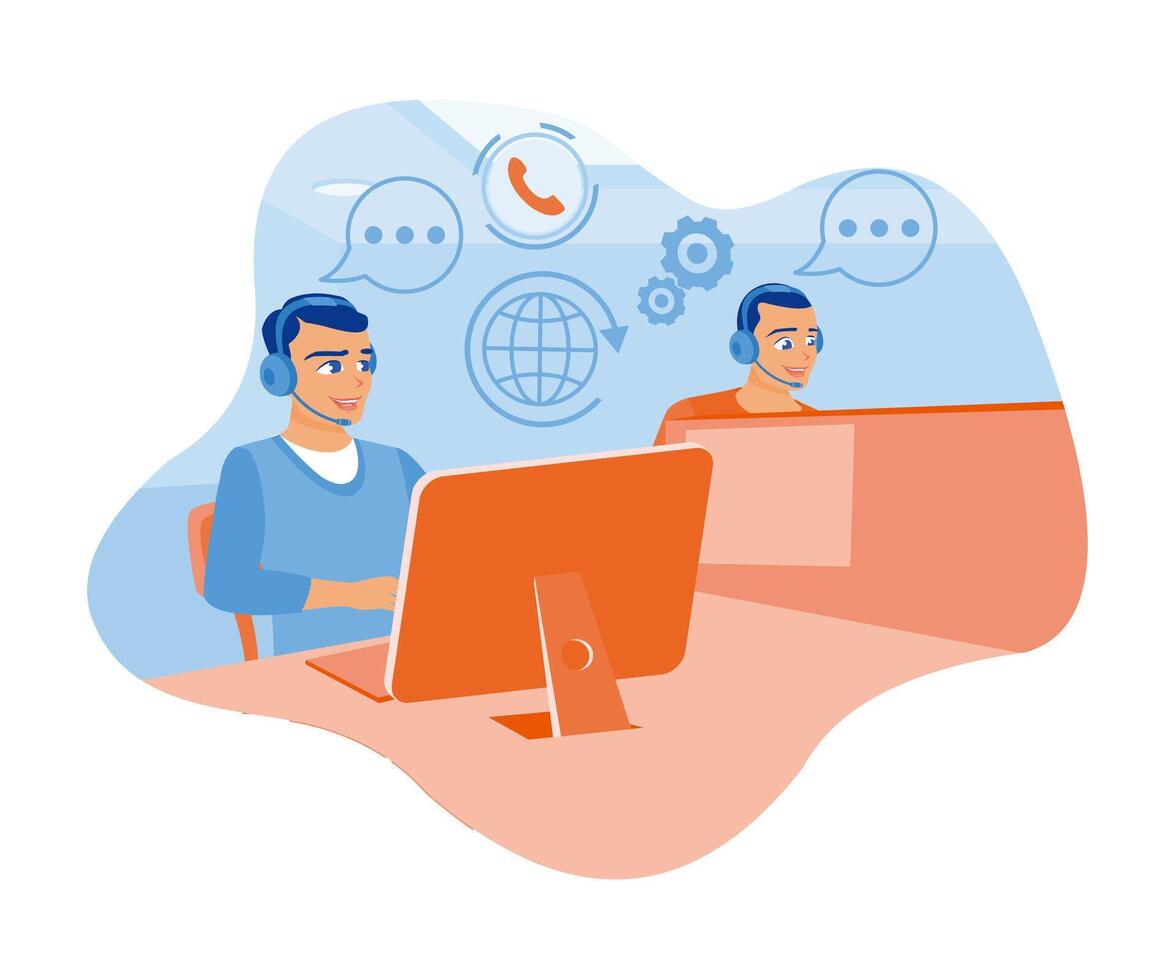 Two men work in a call center office. Talking to a client using a headset in front of a computer. Woman with phone calling to customer support service concept. flat vector modern illustration Pro Vector