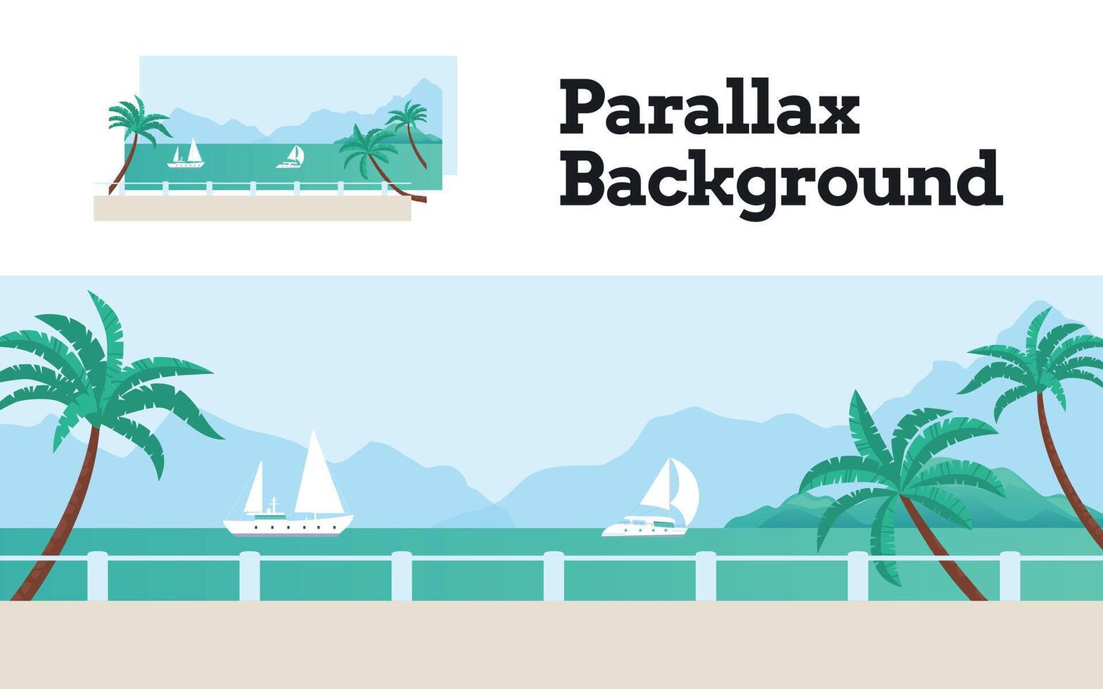 Parallax effect scene with seafront, coast line embankment with palm Pro Vector