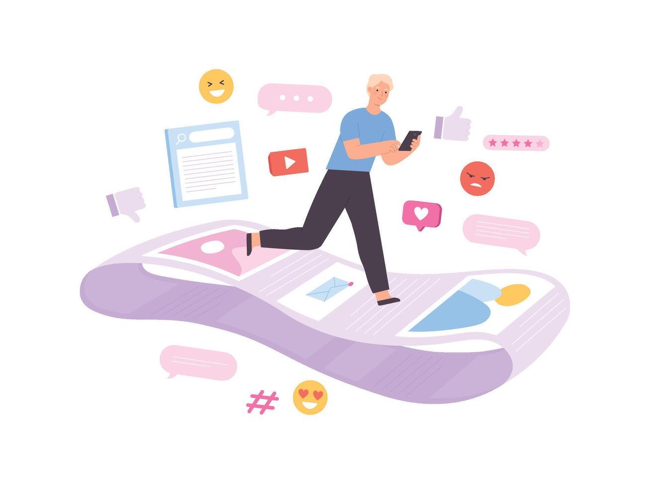 Social network addiction, man running on endless notification line. Feedback addicted character scrolls internet pages, flat vector concept Pro Vector