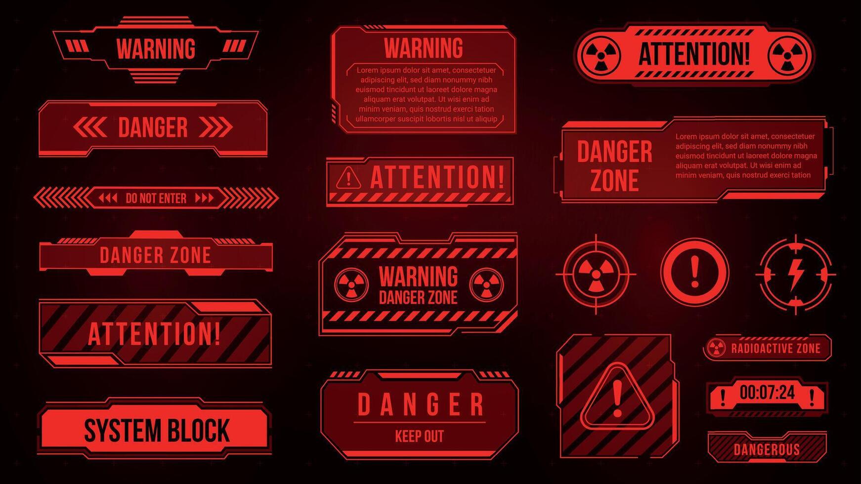 Futuristic HUD danger zone and alert caution screens. Warning and attention red hologram frames and signs. Cyber interface alarm vector set Pro Vector