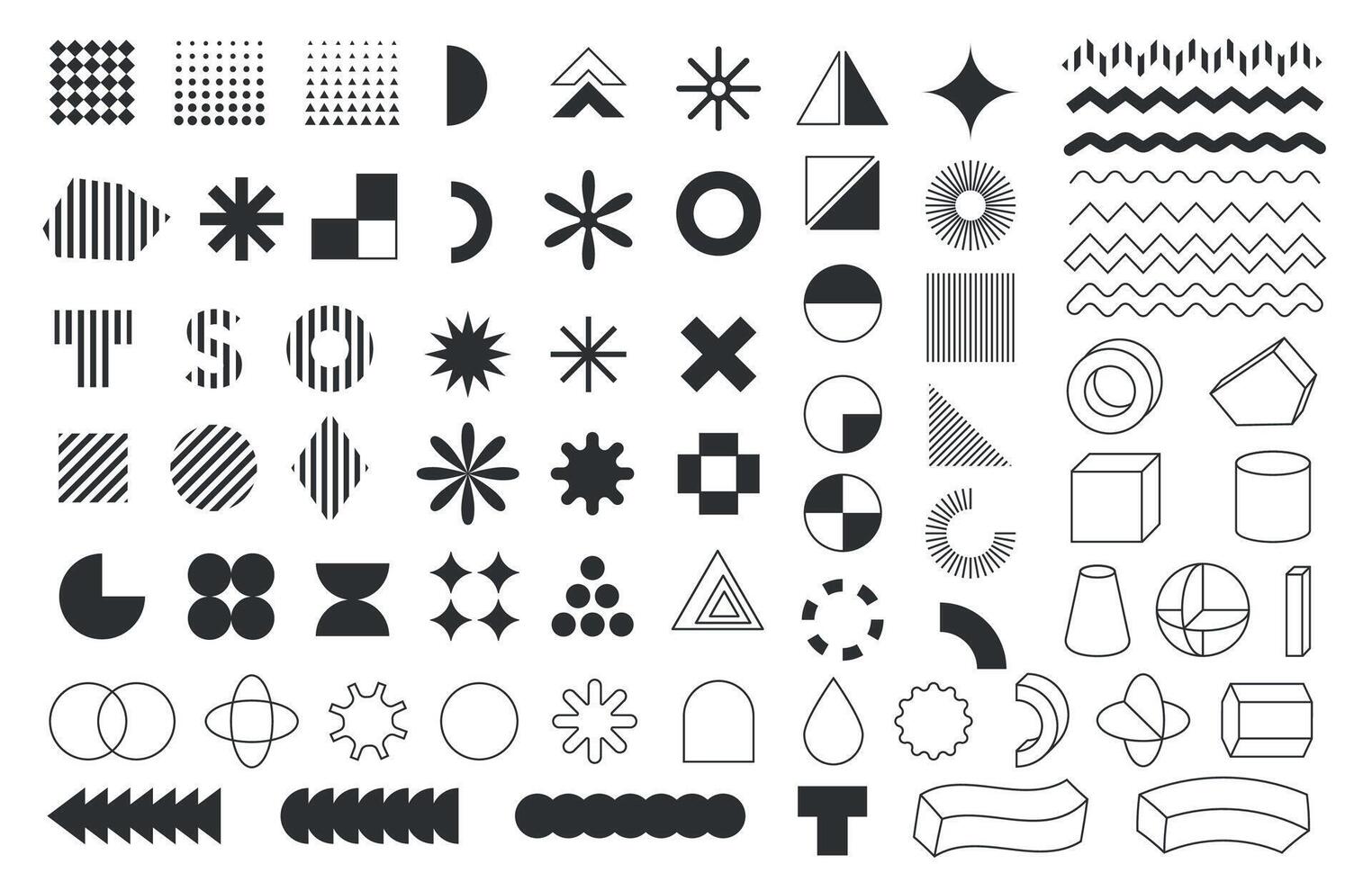 Retro geometric shapes. Abstract minimal lines and circles for modern design, stripe mosaic and ornamental pattern template. Vector set Pro Vector