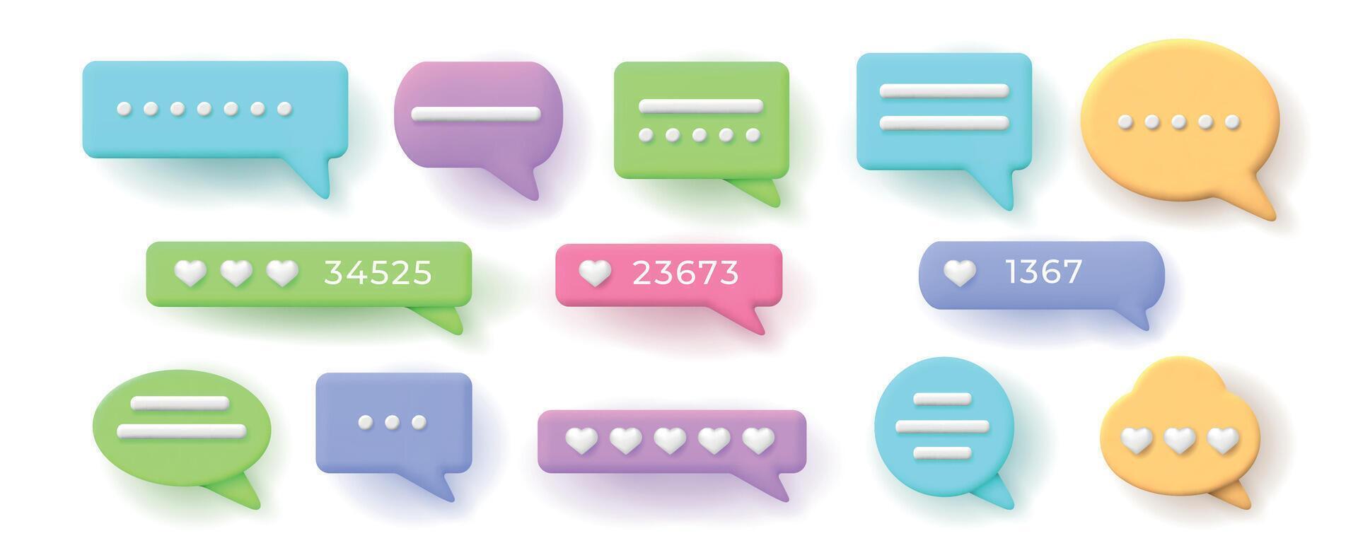 3d speech bubbles for chat messages and like button. Balloon with social network hearts rating. Conversation notification frame vector set Pro Vector