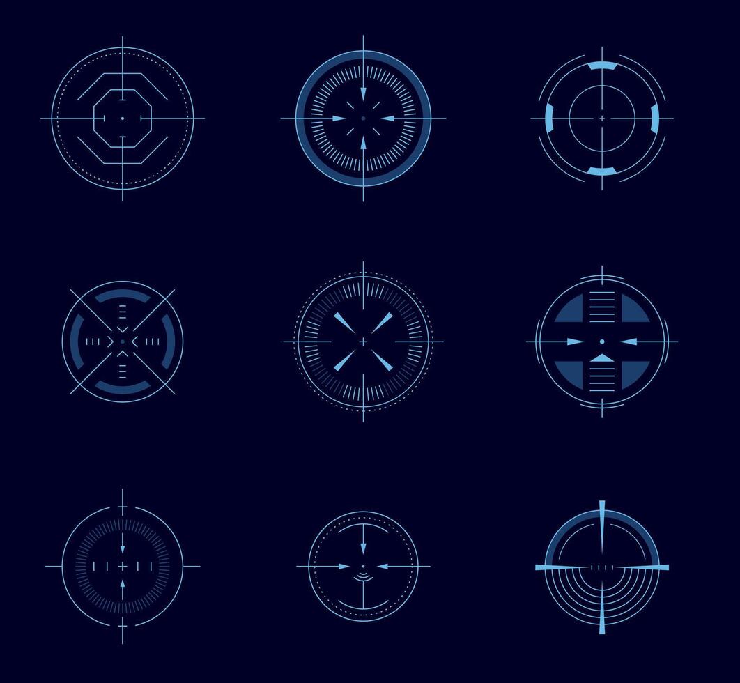 Futuristic aim pointer. Circle HUD user interface element, weapon collimator round aim, digital focus UI game asset. Vector accuracy symbols isolated Pro Vector