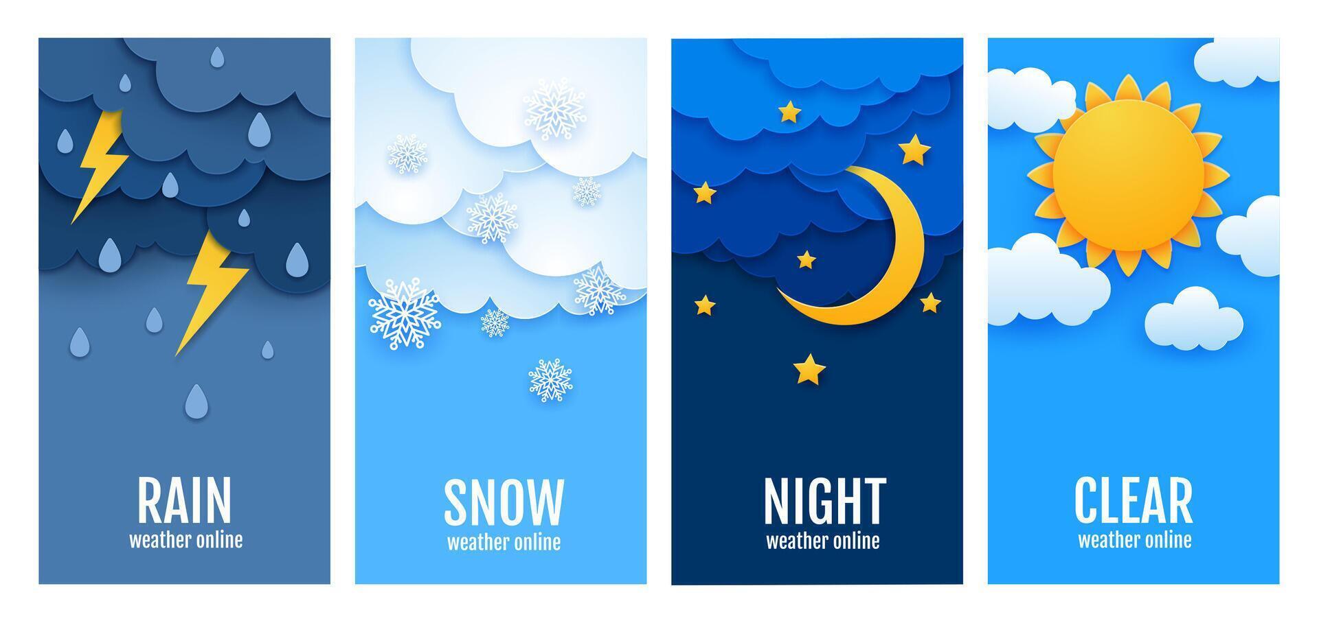 Weather paper cut banners, rain, sun, snow, clouds Pro Vector