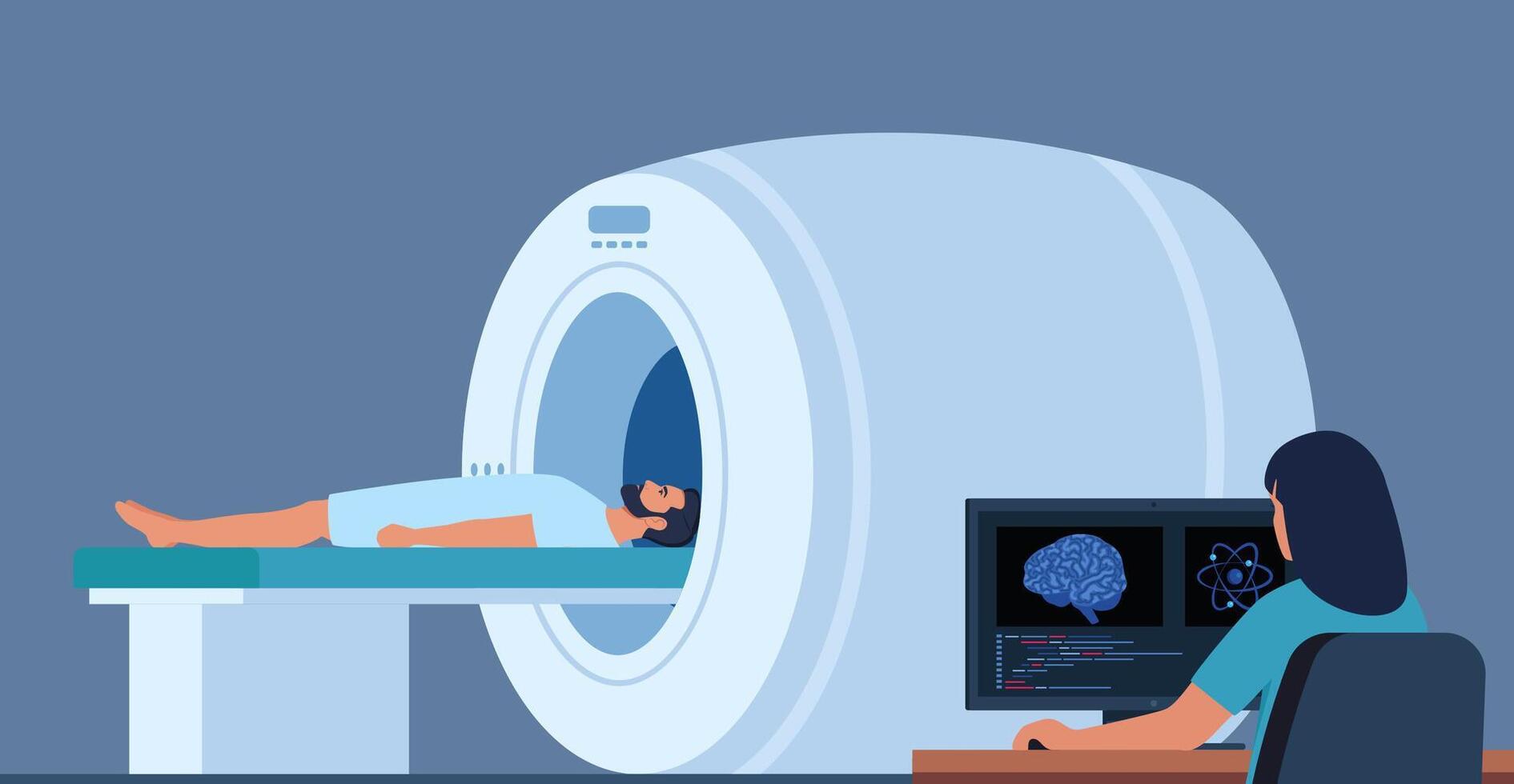 Doctor looking at results of patient brain scan on the monitor screens in front of MRI machine with patient lying down. Flat vector illustration. Pro Vector