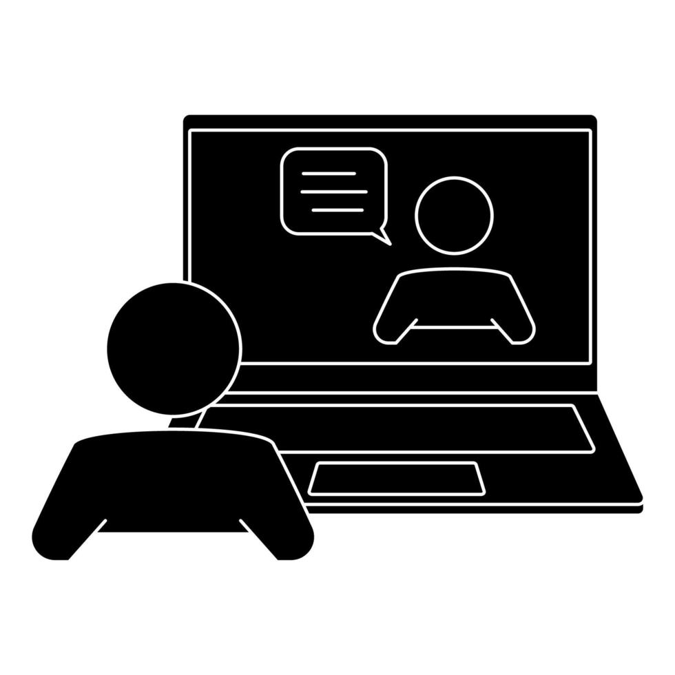 Online job interview. Online communication, chatting. Customer support or service, technical assistance. Outsource support symbol. A man working on laptop with speech bubbles. Glyph icon Pro Vector