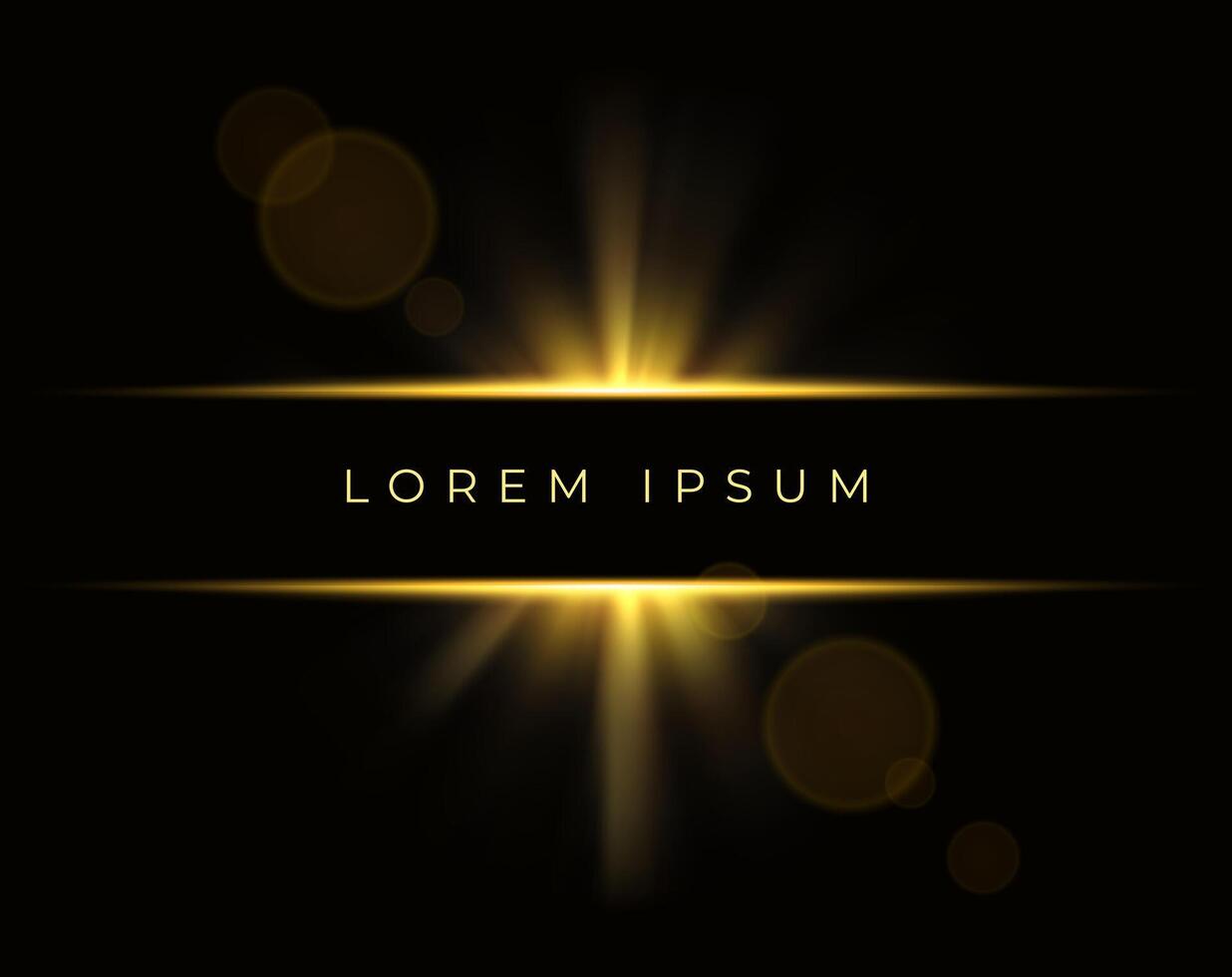 Vector banner with light golden flash and copy space. Glowing frame for text with bright yellow rays on dark background. Lens effect. Abstract, futuristic wallpaper. Space illustration. Pro Vector
