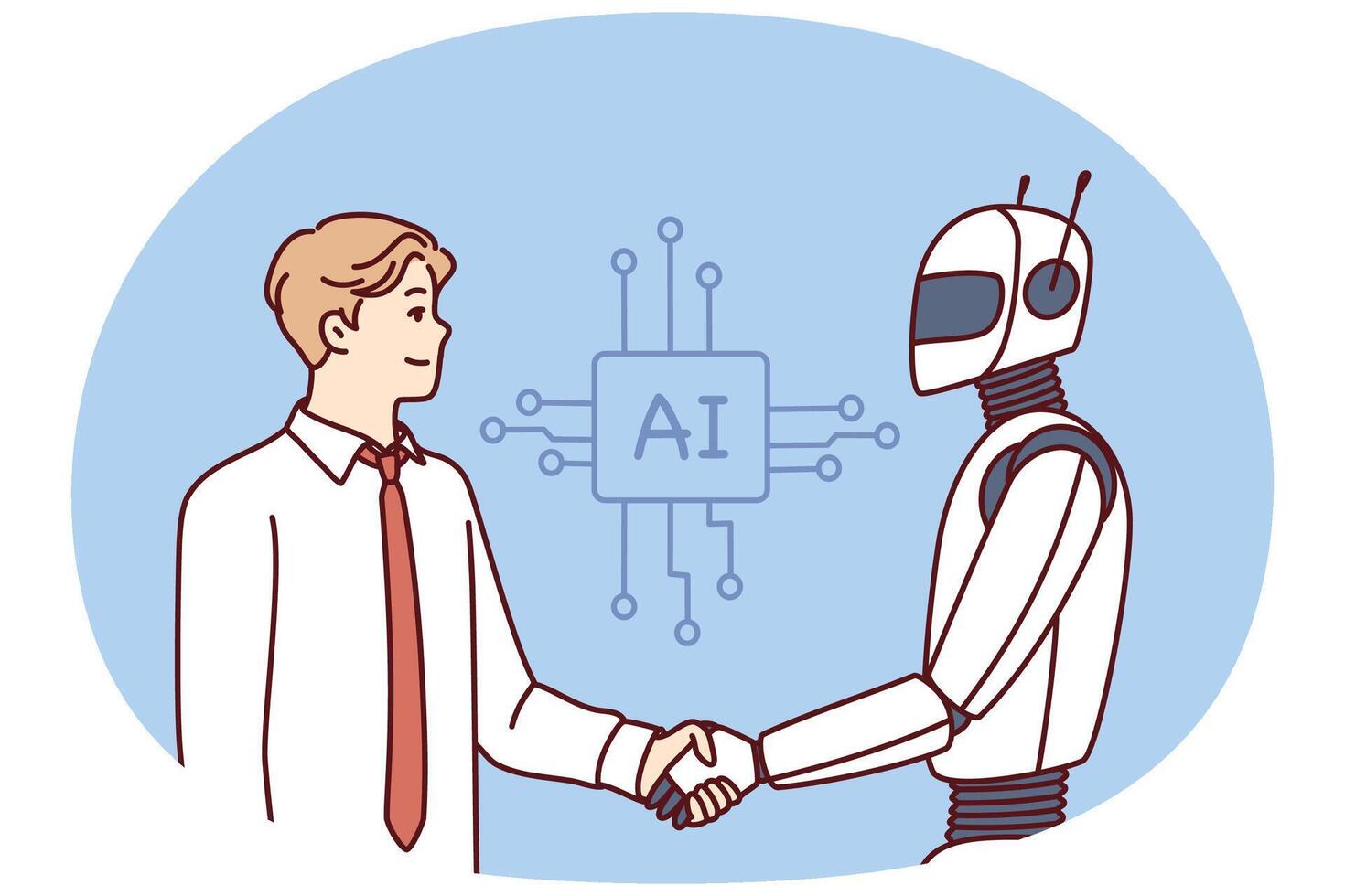 Man shakes hands with robot as sign of friendship between humans and artificial intelligence AI Pro Vector