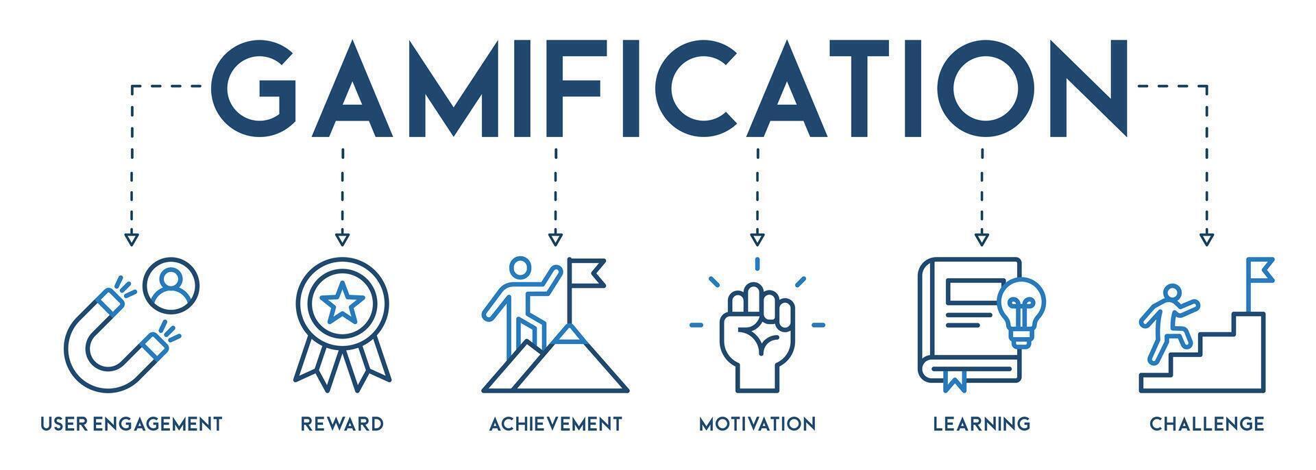 Gamification banner vector illustration concept with the icon and symbol of user-engagement, reward, achievement, motivation, learning and challenge Pro Vector