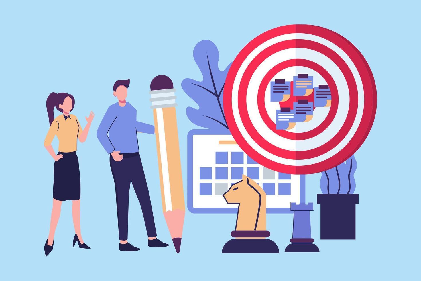 Goal setting, achievable target or purposeful objective, mission to accomplish or challenge to win for business success concept, businessman write down goal on notes and put on big dartboard target. Pro Vector
