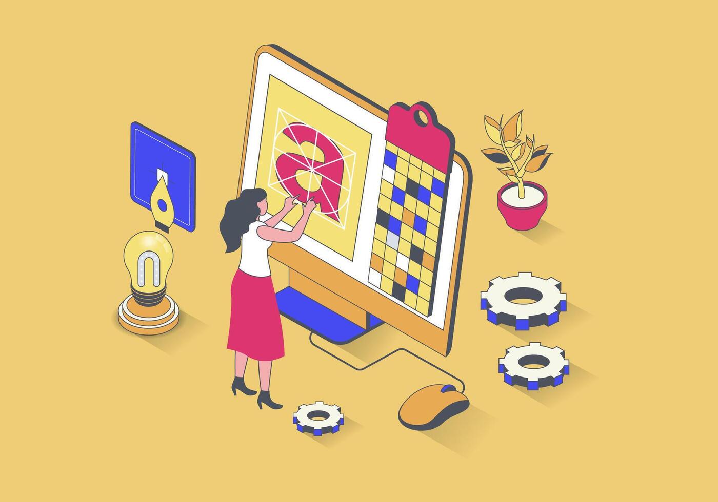 Design studio concept in 3d isometric design. Woman creating logo for branding, drawing digital content and selecting colours palette. Vector illustration with isometry people scene for web graphic Pro Vector