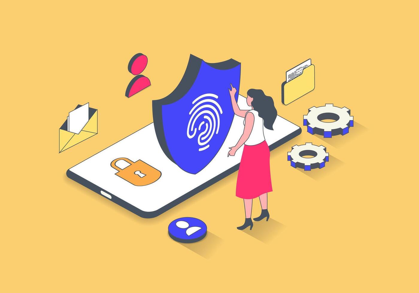Cyber security concept in 3d isometric design. Woman scanning fingerprint for secure access and authentication, internet data protection. Vector illustration with isometry people scene for web graphic Pro Vector