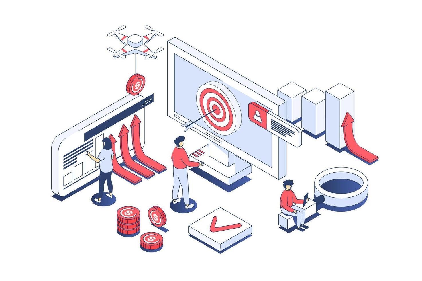 Business strategy concept in 3d isometric design. Employees analyzing data graphs, achieving goals, targeting and developing company. Vector illustration with isometry people scene for web graphic Pro Vector