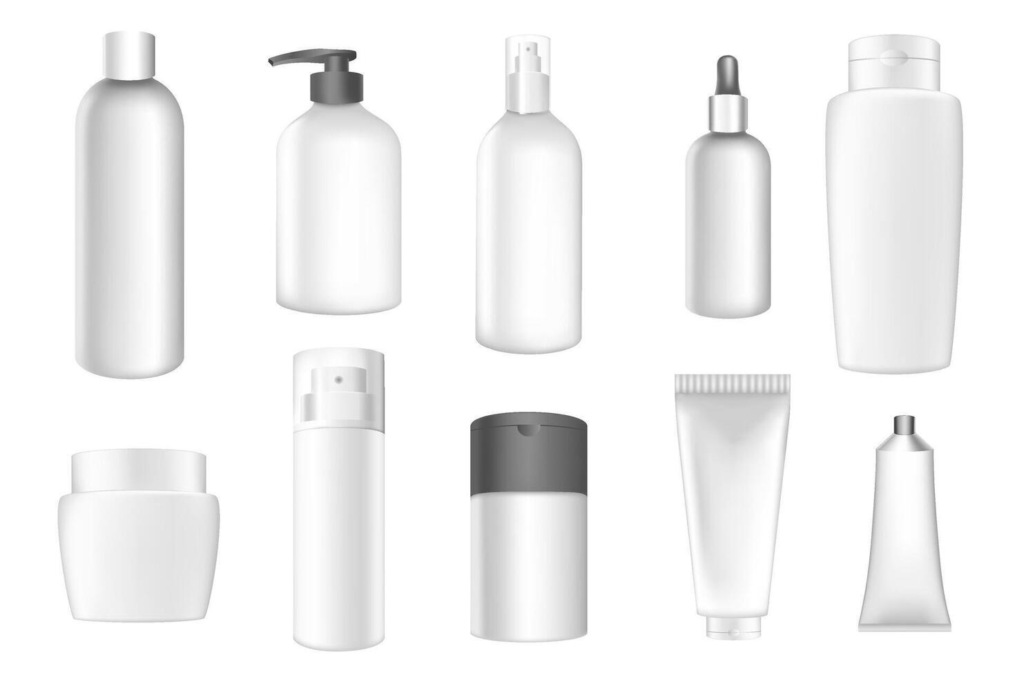 Cosmetic packages mega set in 3d realistic design. Bundle elements of white containers with empty text spaces of shampoo bottle, cream tube, lotion, other. Vector illustration isolated graphic objects Pro Vector