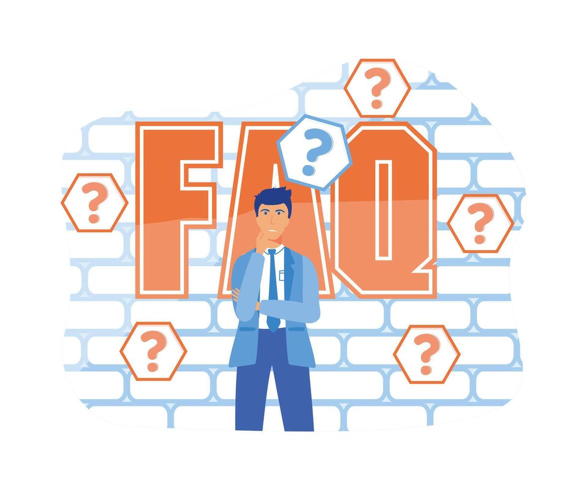 Thinking man with question mark. Confused, doubts, curious. Frequently Asked Questions. flat vector modern illustration Pro Vector