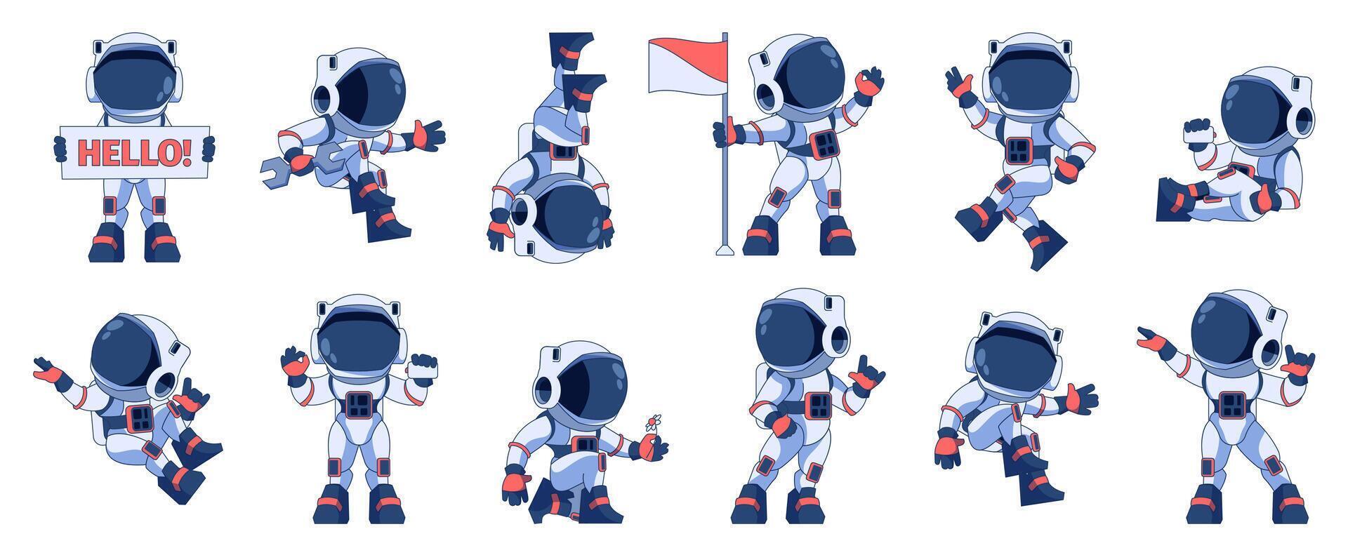 Astronaut character set. Cartoon space explorers in different poses, cosmic spacemen in suits and helmets, astronaut characters in spacesuits. Vector set Pro Vector