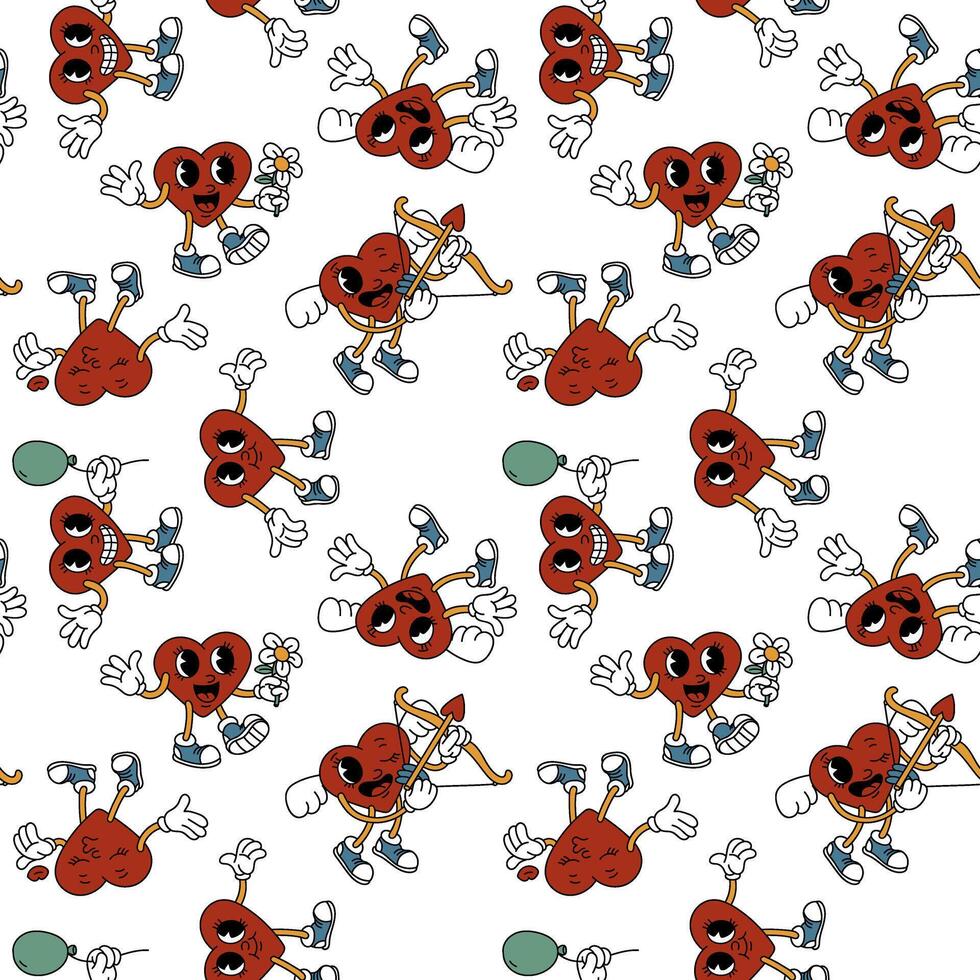 Trendy groovy heart guy pattern. A guy in the shape of a heart in different poses, a retro character. With wings, flowers, balloons. Vector flat character for valentine's day. Texture for the holiday Pro Vector