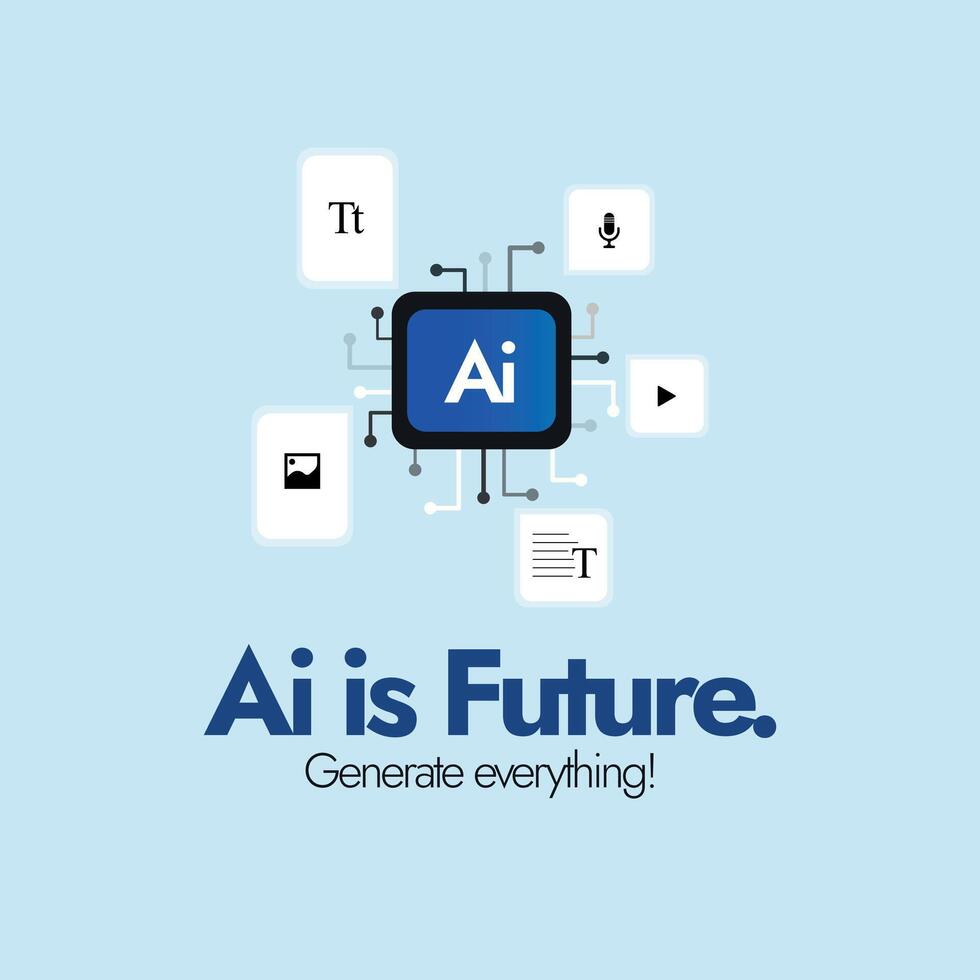 AI is future. Artificial intelligence is future concept banner and post with Ai icon. AI generative tools concept with icons of chatbots, image creation, music production, video making. Pro Vector