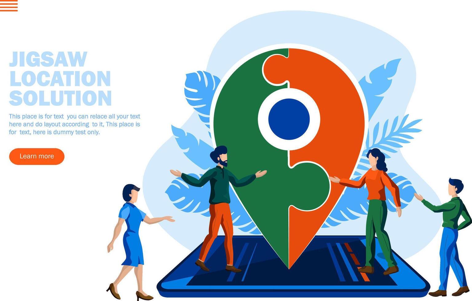 jigsaw location solution with team discussion and strategy on mobile concept vector illustration Pro Vector