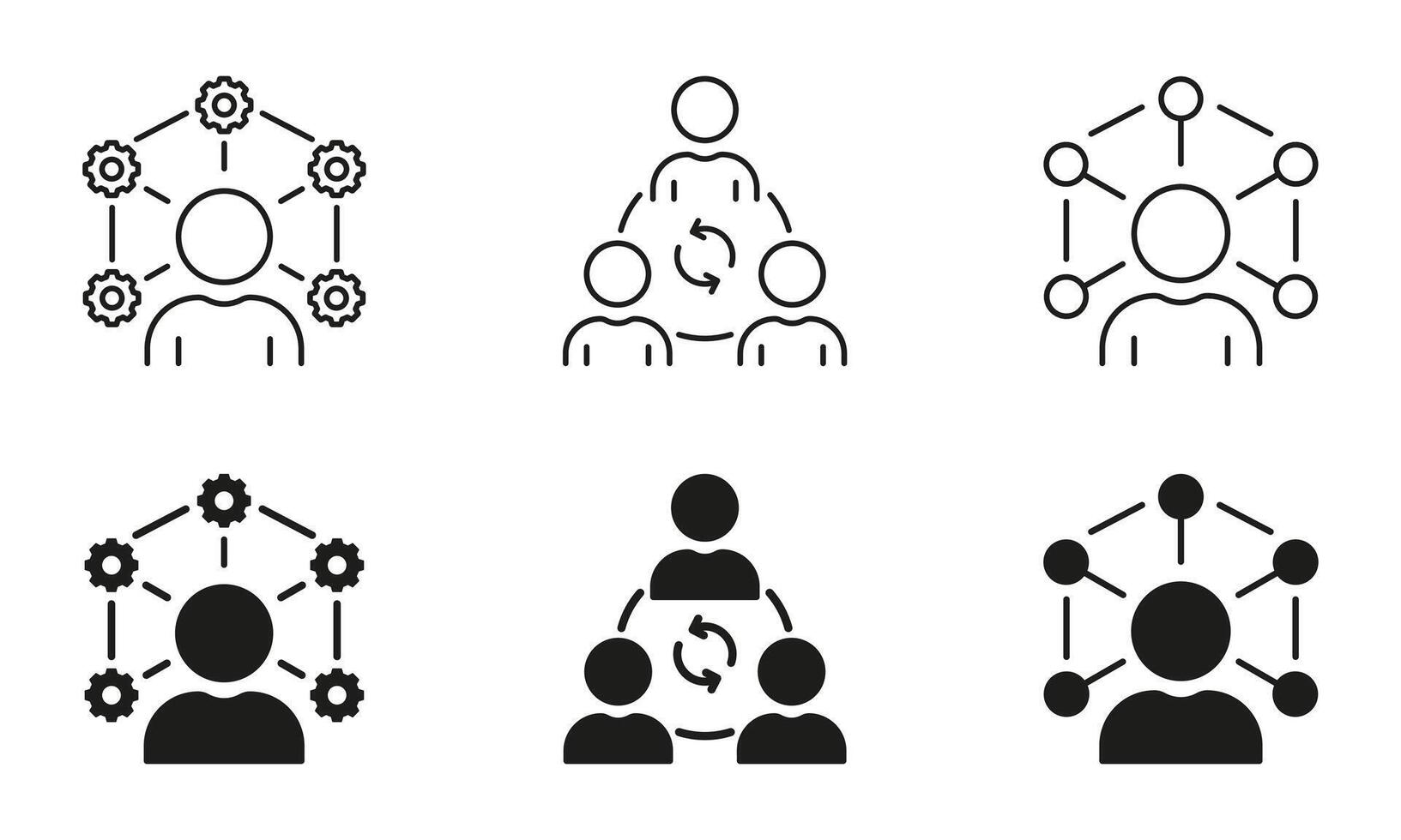 Efficient Person At Work Line and Silhouette Icon Set. Development, Productivity Pictogram. Employee Training Symbol. Optimize Job Processes, Flexibility Skills. Isolated Vector Illustration Pro Vector