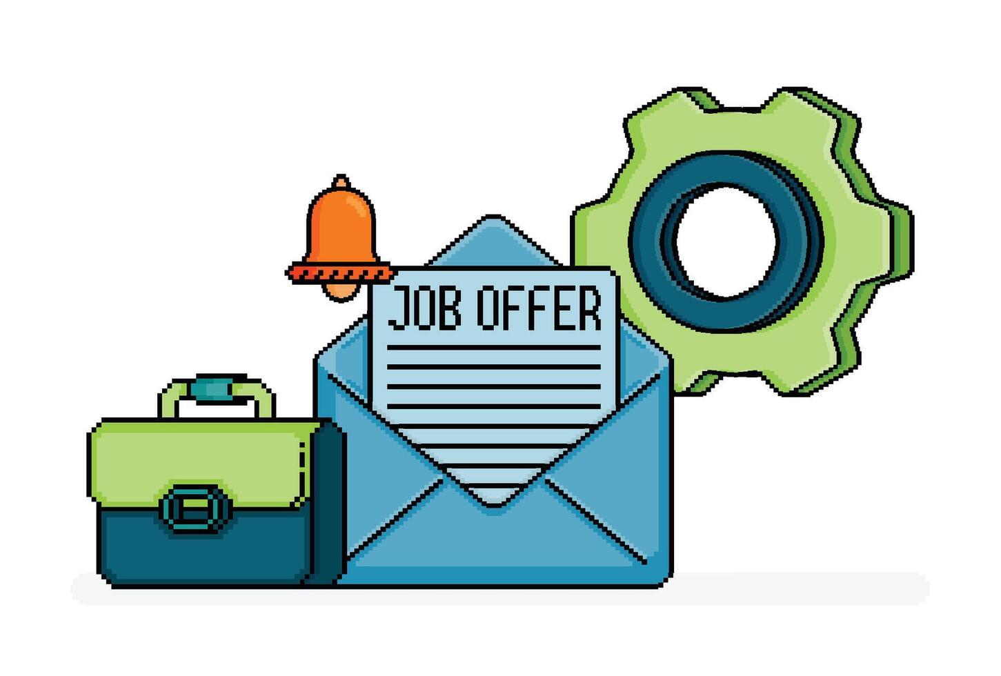 pixel line art of open email with job offer letter and notification, briefcase and gear wheel for metaphor of hiring offer. Can be used for web, website, landing page, apps, flyers, brochures, ads Free Vector
