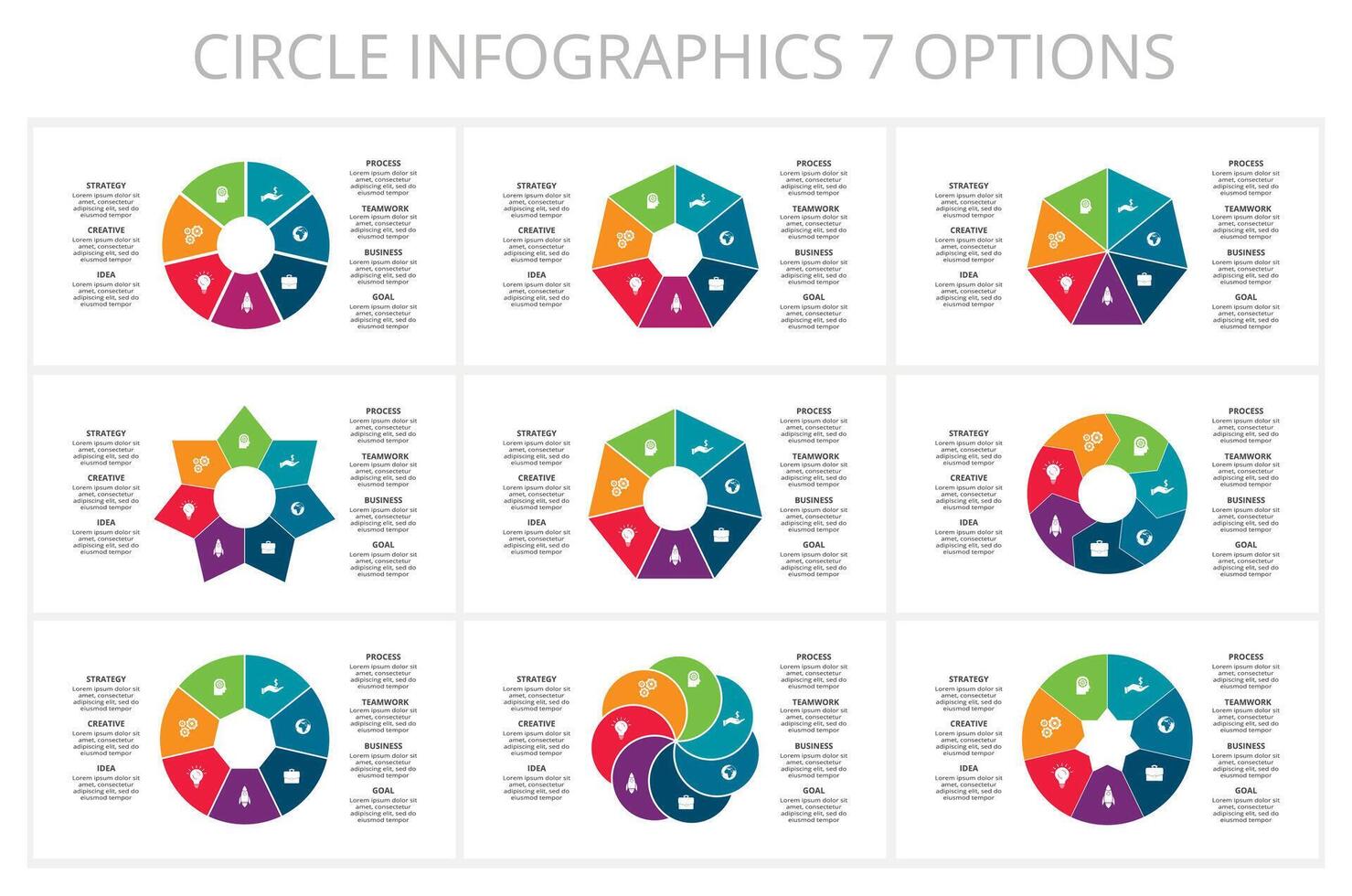 Set circle elements of graph, diagram with 7 steps, options, parts or processes. Template for infographic, presentation. Pro Vector