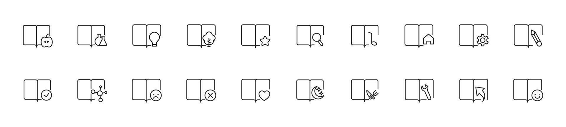 Collection of thin line icons of signs by books as symbol of education. Linear sign and editable stroke. Suitable for web sites, books, articles Pro Vector