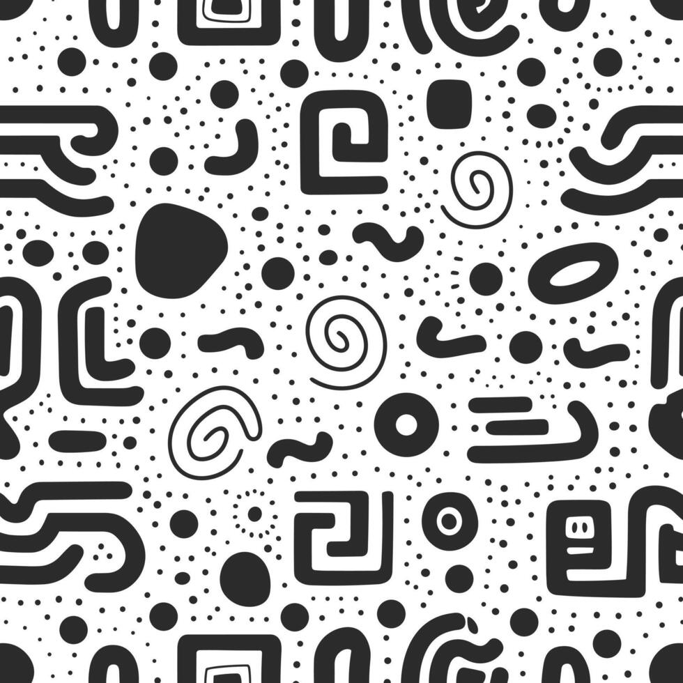 Seamless pattern with simple lines and shapes in black on white background, an array of small and medium-sized hand drawn line art circles, squares, triangles, dots, and wavy thick and thin strokes vector