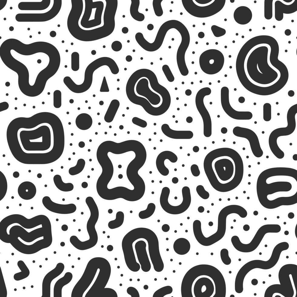 Seamless pattern with simple lines and shapes in black on white background, an array of small and medium-sized hand drawn line art circles, squares, triangles, dots, and wavy thick and thin strokes vector