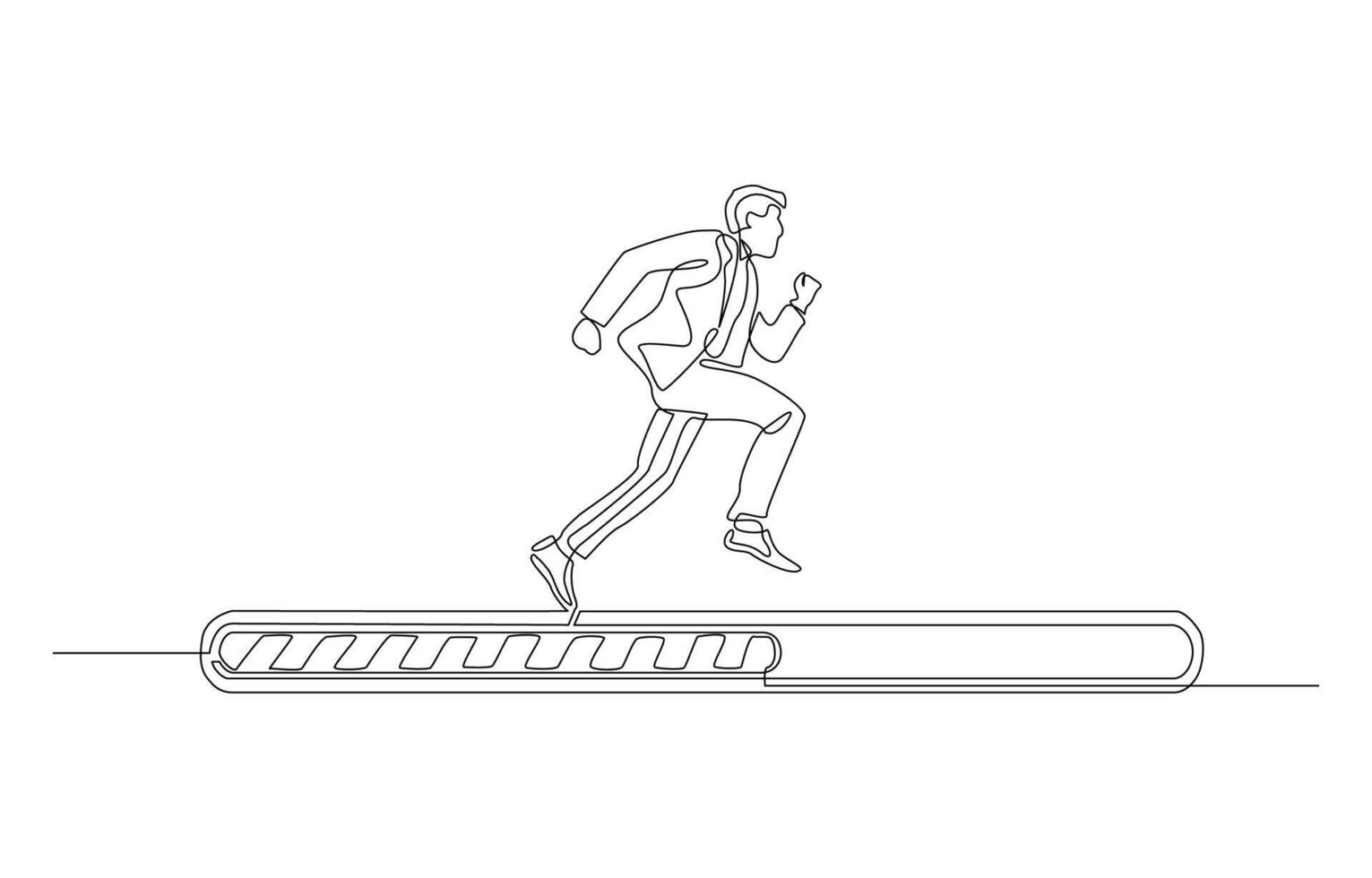Continuous one line drawing of businessman running on loading bar, working progress concept, single line art. Pro Vector