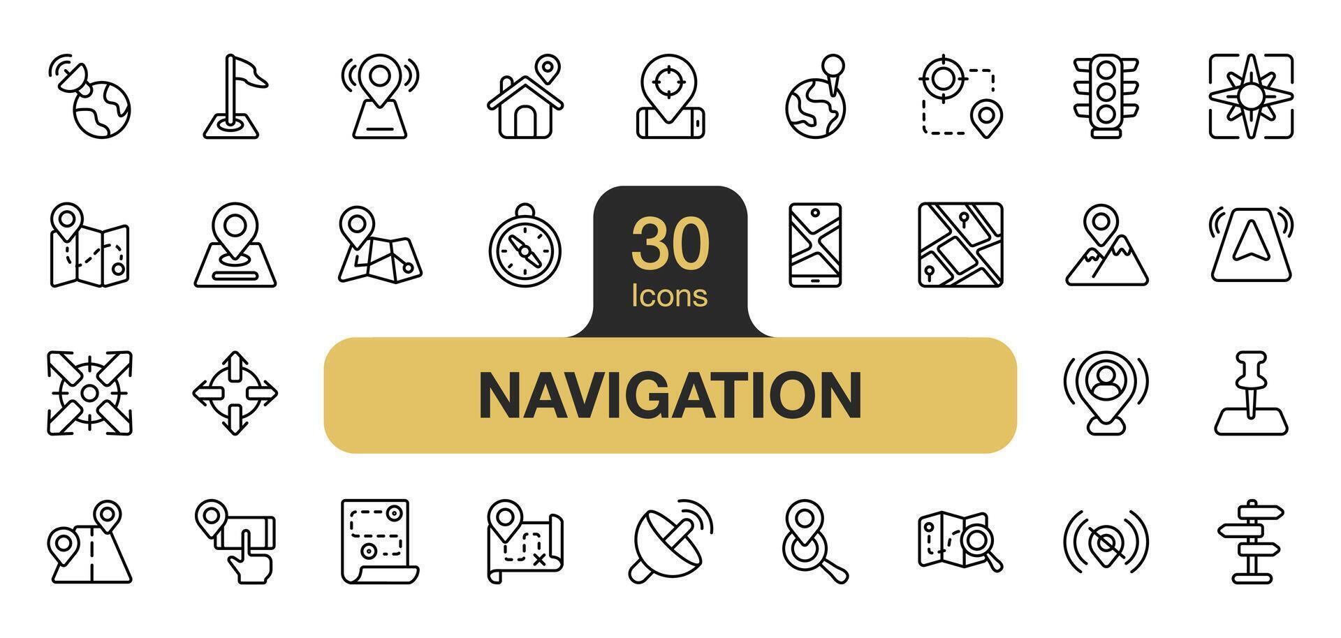 Set of 30 Navigation icon element set. Includes compass, maps, route, mountain, location, road, tracker, and More. Outline icons vector collection. Pro Vector