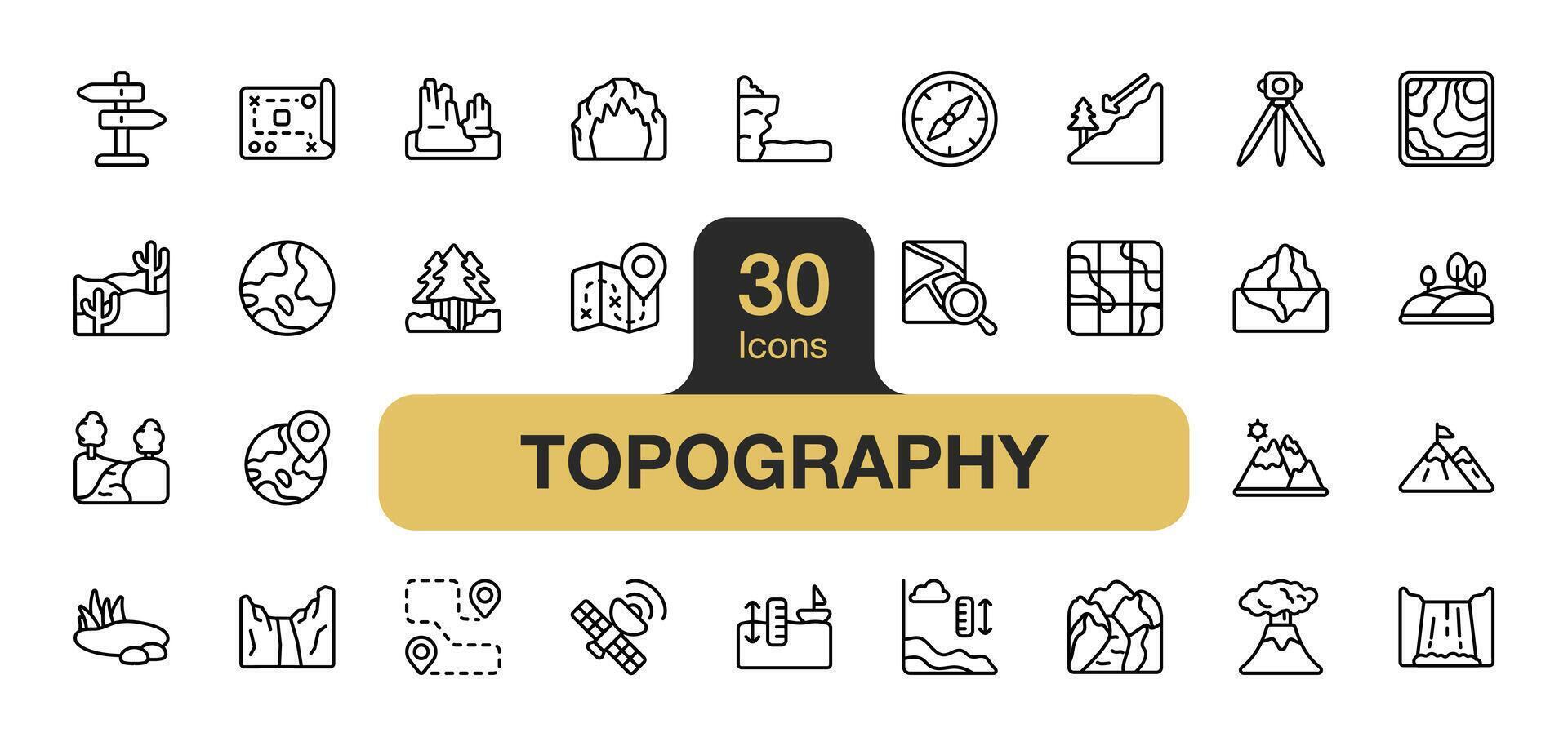 Set of 30 Topography icon element set. Includes canyon, cliff, desert, forest, lake, mountain and More. Outline icons vector collection. Pro Vector