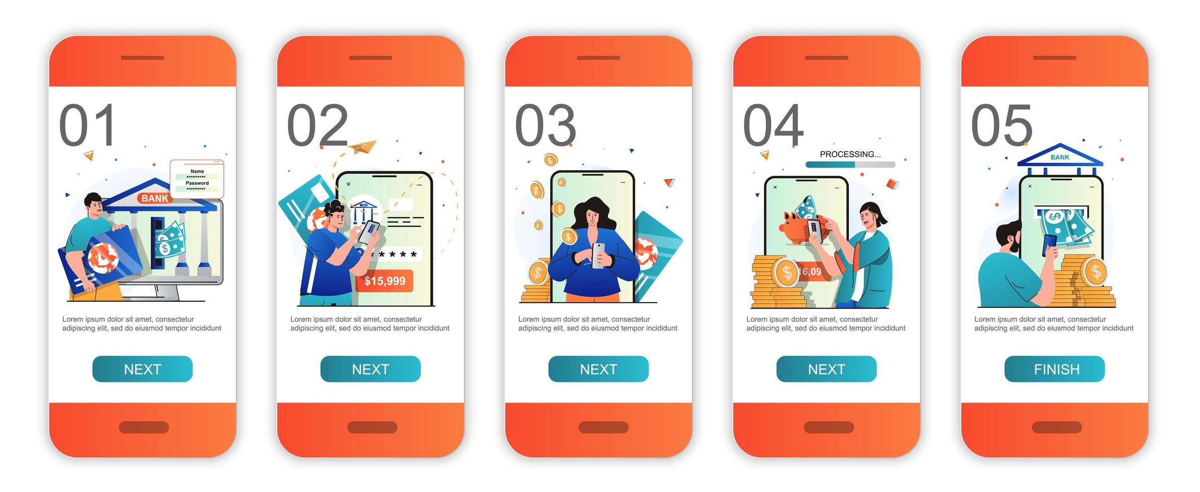 Mobile banking concept onboarding screens for mobile app templates. Online payment, accounting. Modern UI, UX, GUI screens user interface kit with people scenes for web design. Vector illustration Pro Vector
