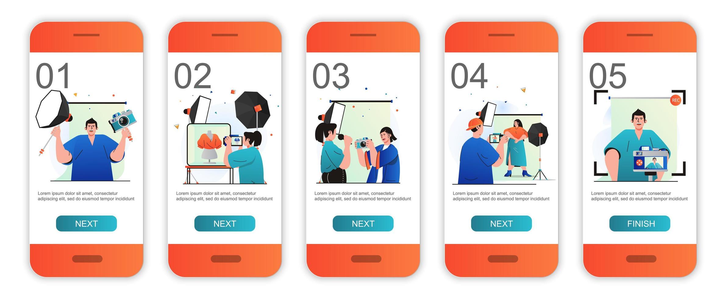 Photo studio concept onboarding screens for mobile app templates. Photographers do photo shoots. Modern UI, UX, GUI screens user interface kit with people scenes for web design. Vector illustration Pro Vector